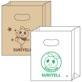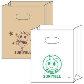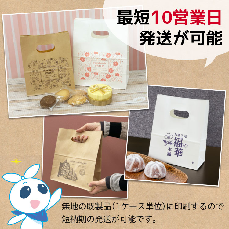 使いやすい持ち手穴が付いた角底紙袋に、片面1色印刷ができます。無地の既製品(1ケース 500枚入)に印刷するので、最短10 営業日後の発送が可能!