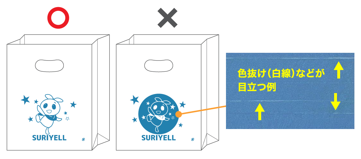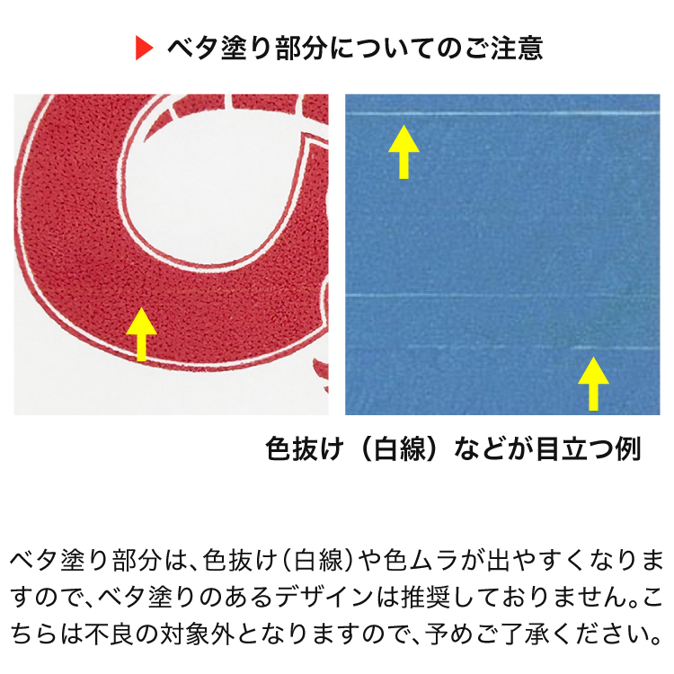 ベタ塗り部分は、色抜け(白線)や色ムラが出やすくなりますので、ベタ塗りのあるデザインは推奨しておりません。こちらは不良の対象外となりますので、予めご了承ください。