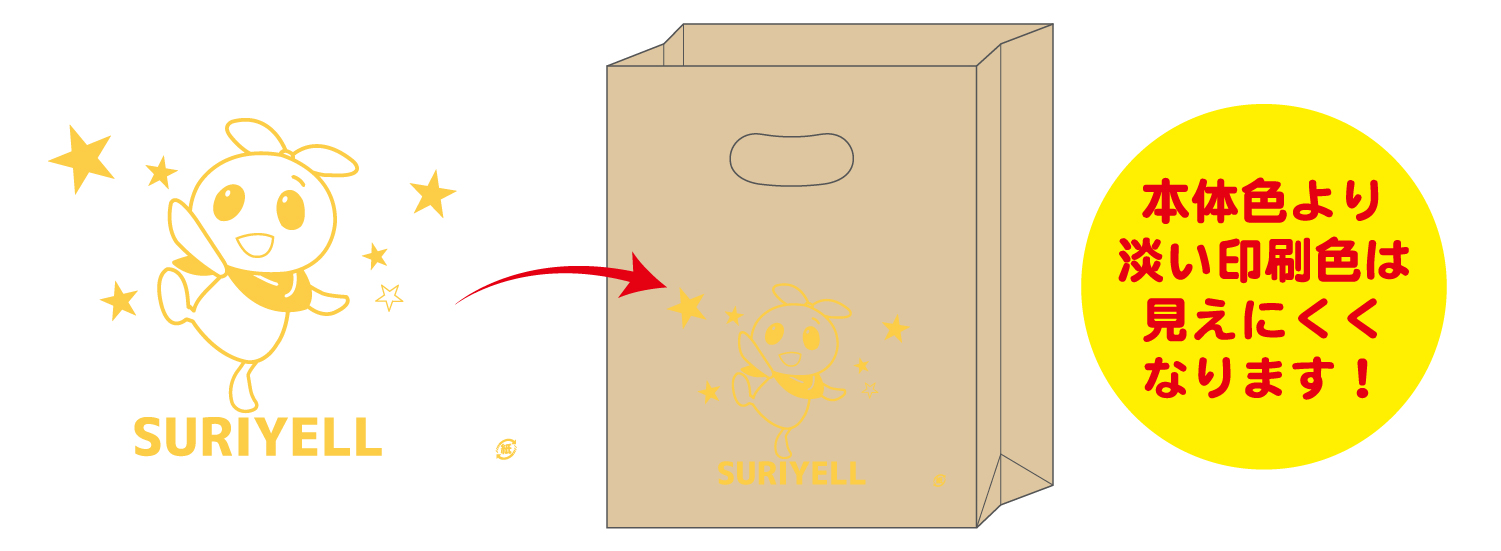 本体色が未晒の場合は、印刷色は下地の色に影響します。淡い色は見えにくくなりますので、ご注意ください。