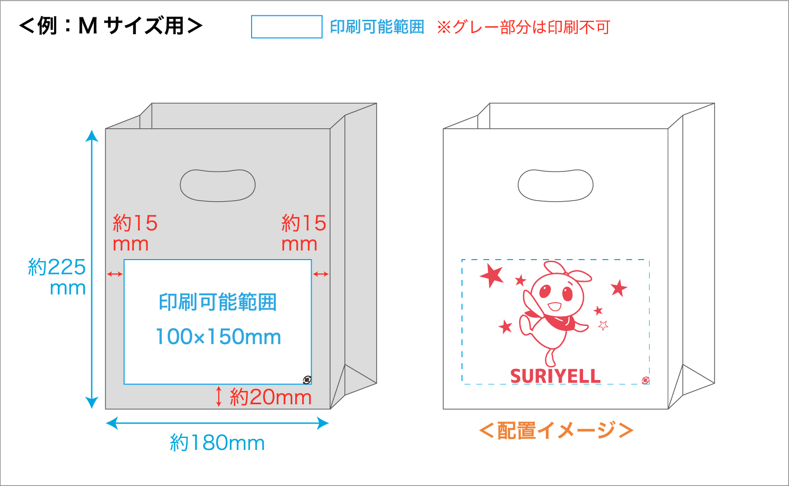 ※袋の下部、左右の約15〜20mmを除く、100×150mm以内が印刷可能サイズです。サイズによって印刷可能サイズが異なりますので、各サイズごとの専用テンプレートをご確認ください。